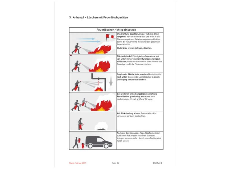 Es enthält Handlungsanweisungen und Regeln zur Brandbekämpfung, zum Verhalten bei Unfällen, Bränden oder sonstigen Schadensfällen. Es liefert zusätzlich Hinweise zur Verhütung von Bränden und gibt Erläuterungen zum Umgang mit Feuerlöschgeräten.