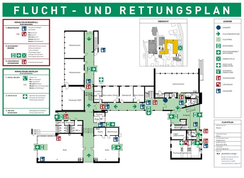 Für Arbeitsstätten und Sonderbauten (Schulen, Bürogebäude, Produktionsstätten, Hotels, Krankenhäuser und Pflegeheime) sind Flucht- und Rettungspläne Pflicht! Flucht- und Rettungspläne sind ein wesentlicher Bestandteil der Sicherheitsausstattung einer baulichen Anlage, bieten einen guten Überblick über die vorhandenen Fluchtwege, Lösch- und Meldeeinrichtungen.
