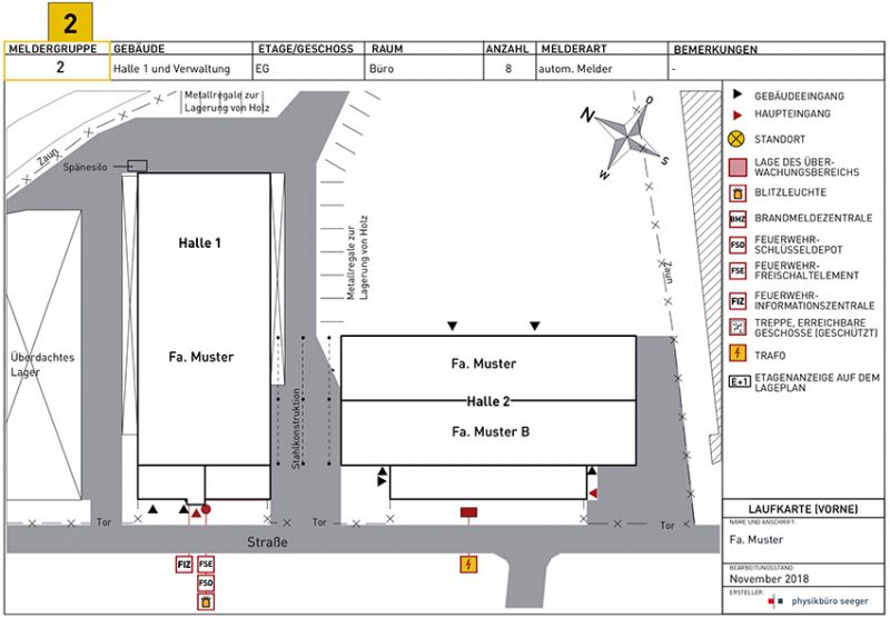 Melderkarten zeigen in farbiger Darstellung die Gebäudeübersicht auf der Vorderseite und den Melderbereich auf der Rückseite. Auf der Gebäudeübersicht werden Standort | BMZ, Einsatzweg, Haupteinfahrt | Eingang und Melderbereich verzeichnet. Weiterhin wird die Übersicht mit Nordpfeil und Maßleiste versehen.
